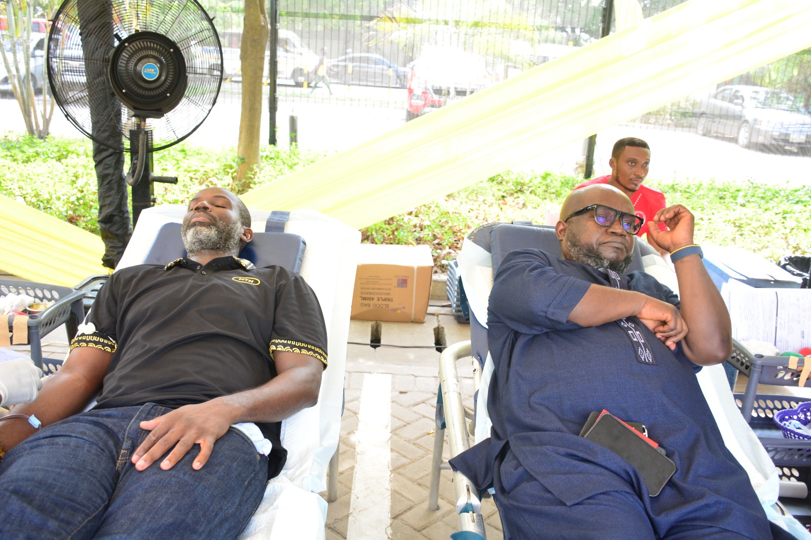 Ing. Dr. Kenneth Ashigbey, CEO of Ghana Chamber of Telecommunications and Nana Kofi Asare MTN GM for Legal and Regulatory donating blood